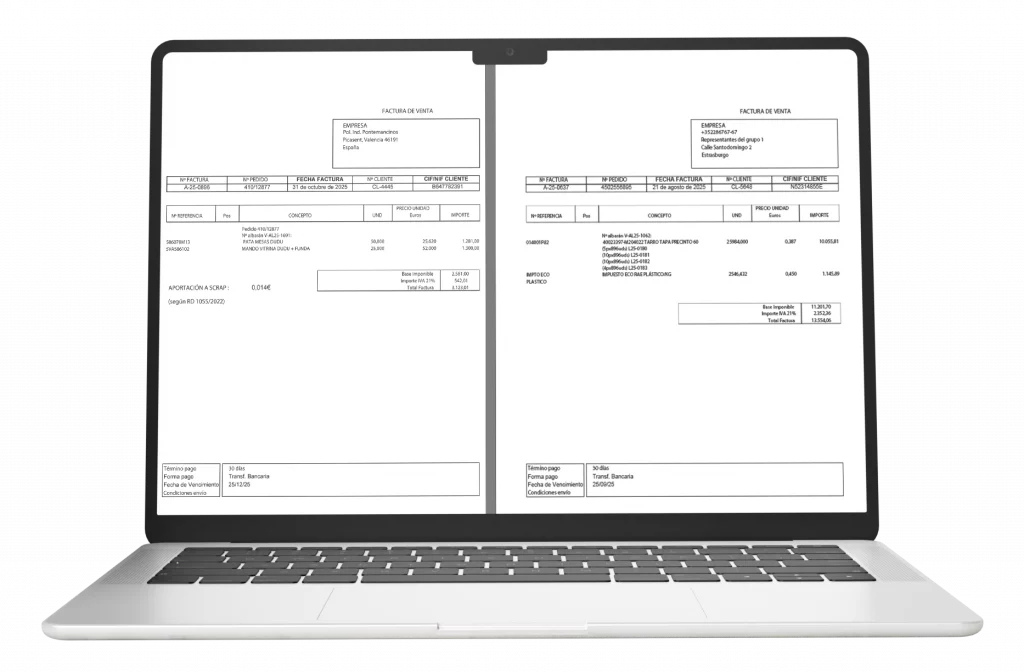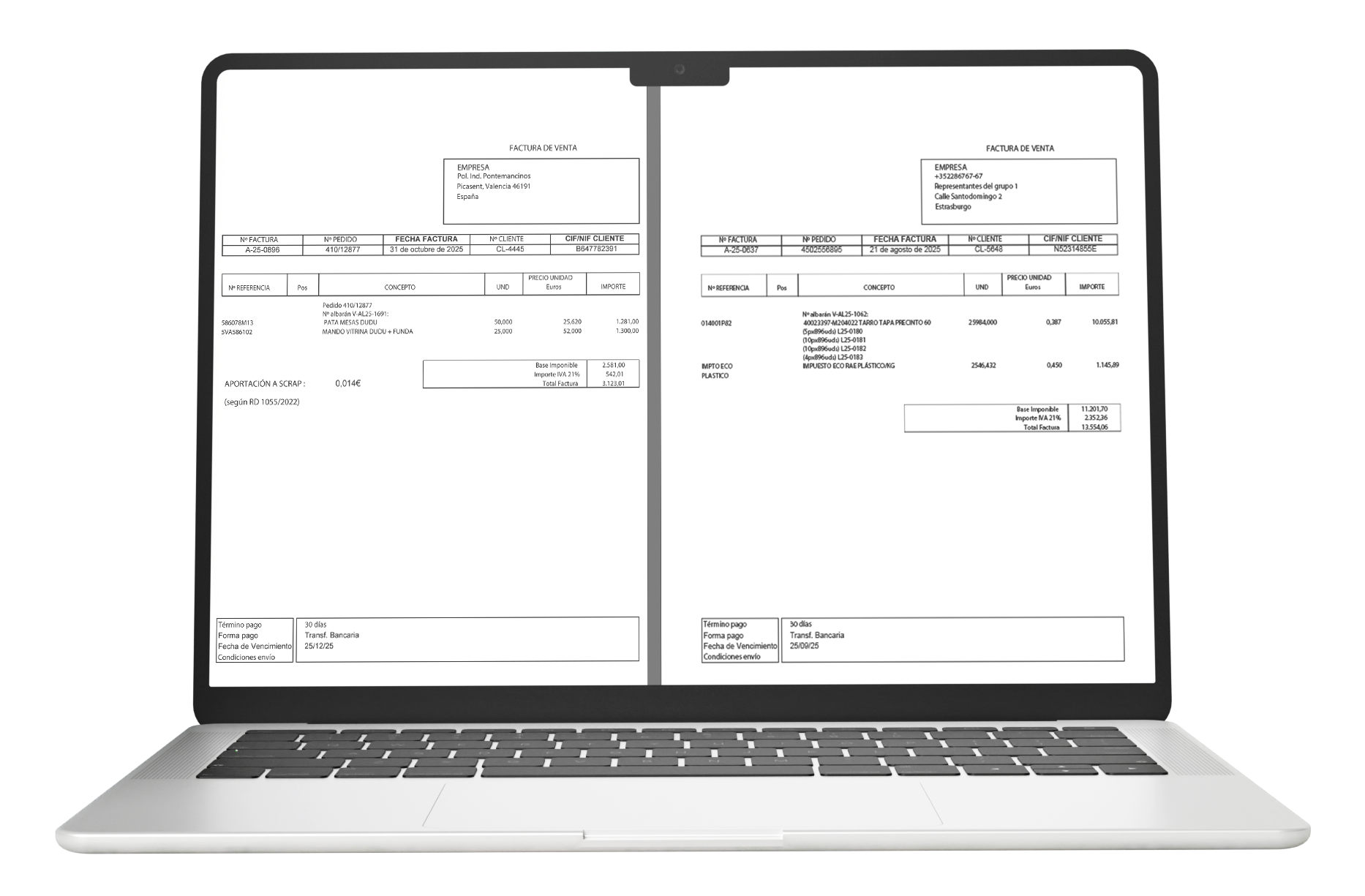 Accede al panel de facturas donde puedes visualizar, de forma clara y detallada, la cantidad de scrap registrada en cada una. Este panel te permite controlar eficazmente la gestión de residuos vinculados a cada factura, facilitando la supervisión y el cumplimiento de la normativa vigente en materia de SCRAP. Además, el sistema automatiza la inclusión de la contribución al SCRAP en las facturas, garantizando la transparencia, trazabilidad y evitando errores o sanciones, lo que optimiza la gestión tanto técnica como administrativa de tu empresa