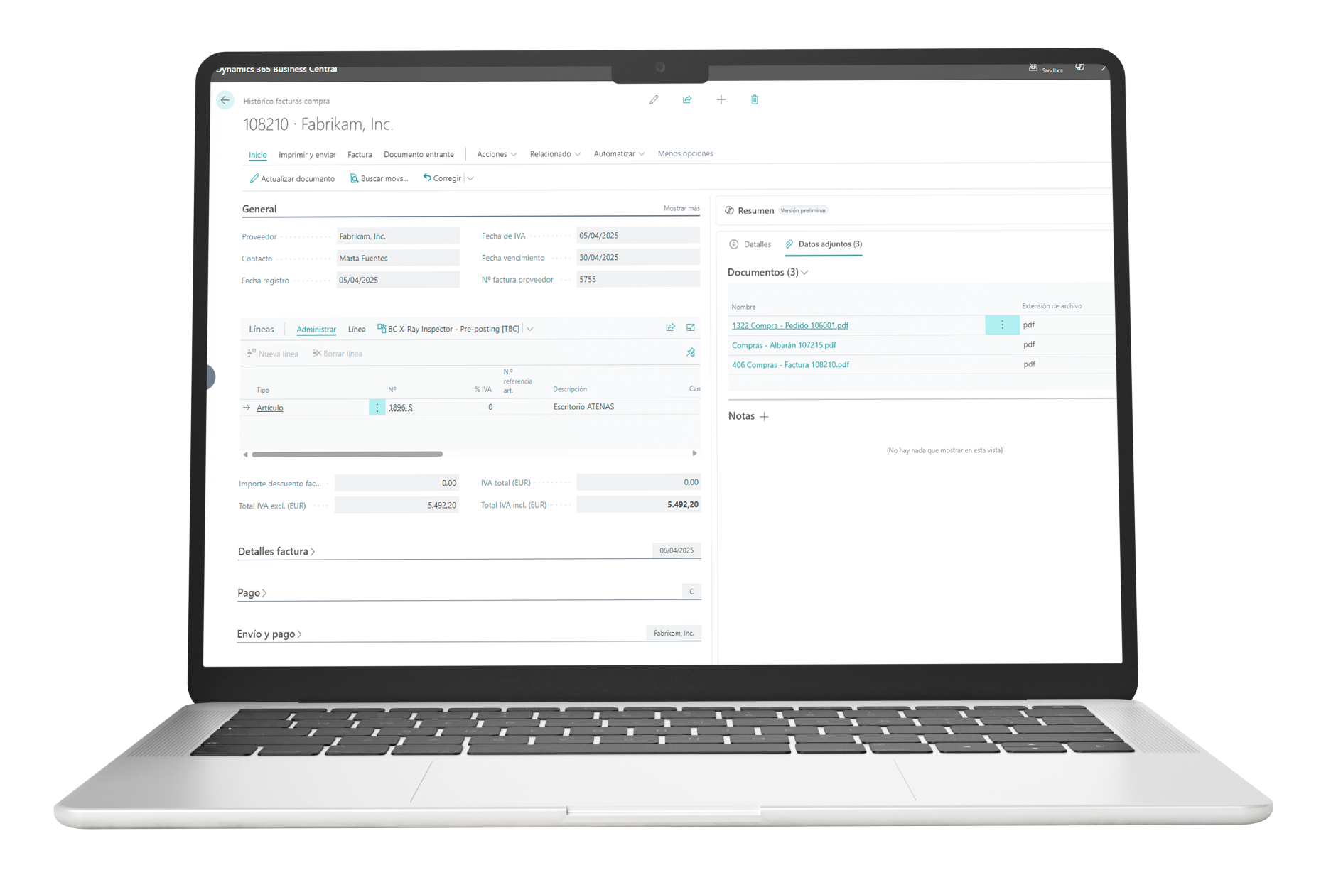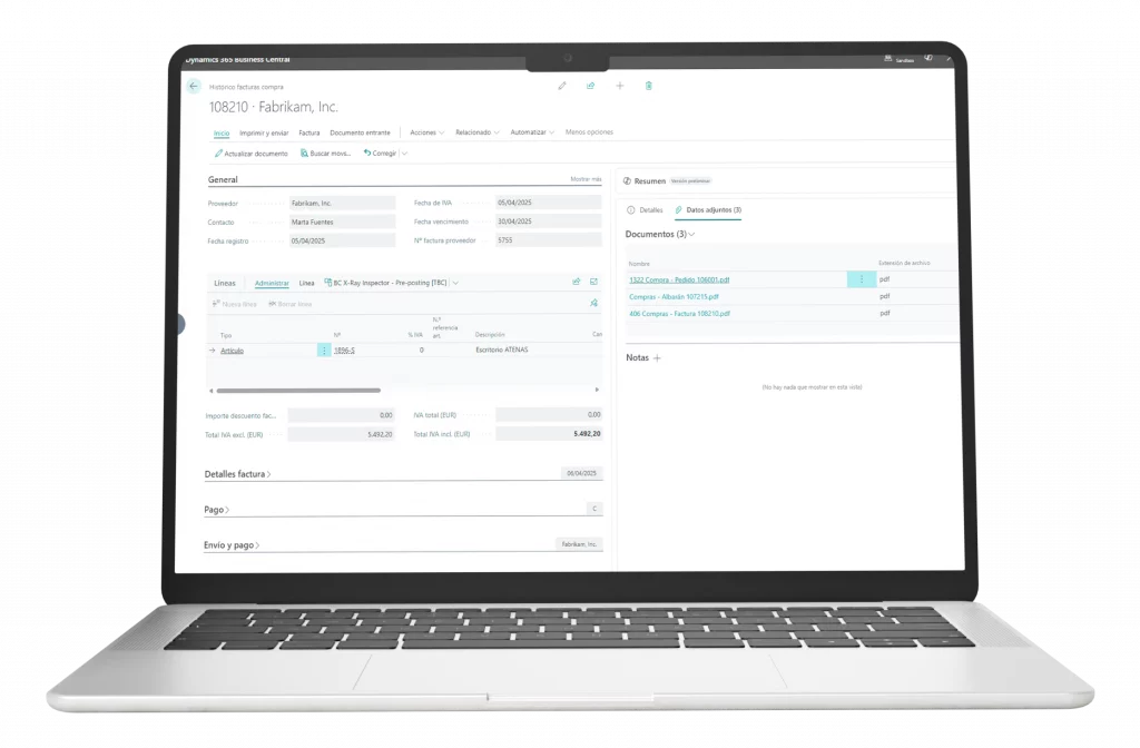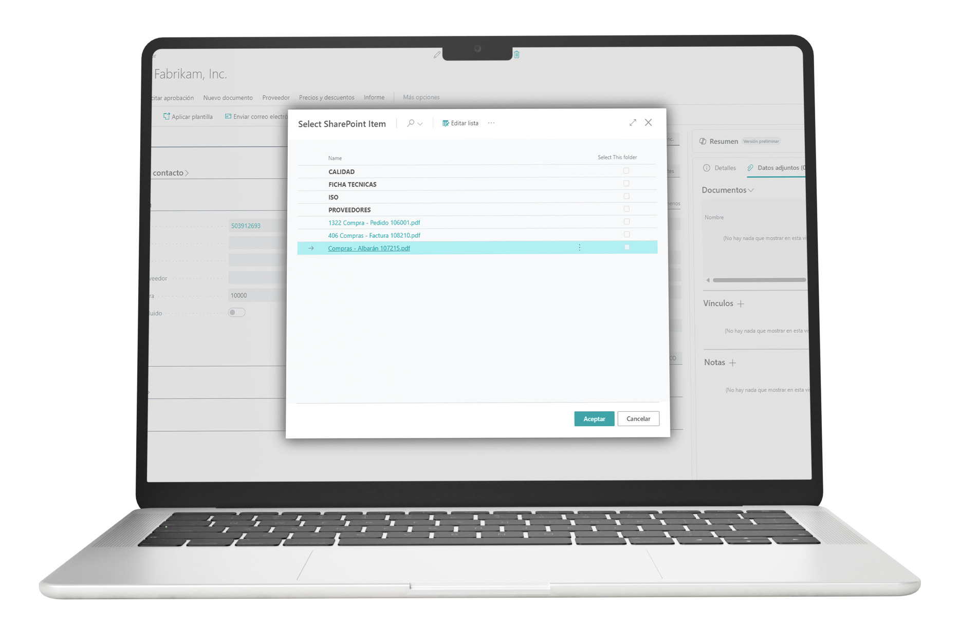 La integración no es unidireccional: puedes subir documentos desde Business Central a SharePoint, pero también adjuntar documentos que ya existen en SharePoint directamente a registros de Business Central.