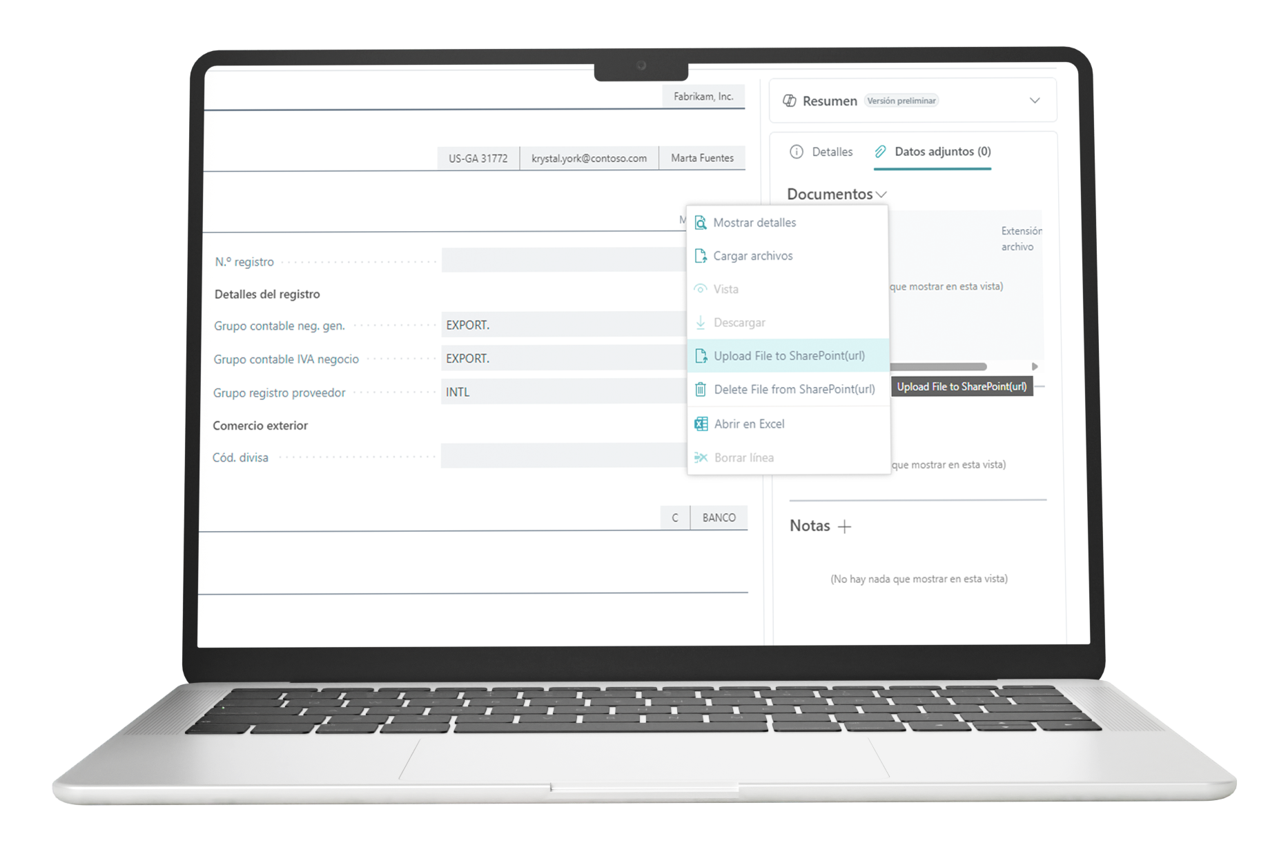 SharePoint → BC: Adjunta documentos externos almacenados en SharePoint (contratos firmados, comprobantes de pago, certificaciones) a los registros relevantes de Business Central sin duplicar archivos.