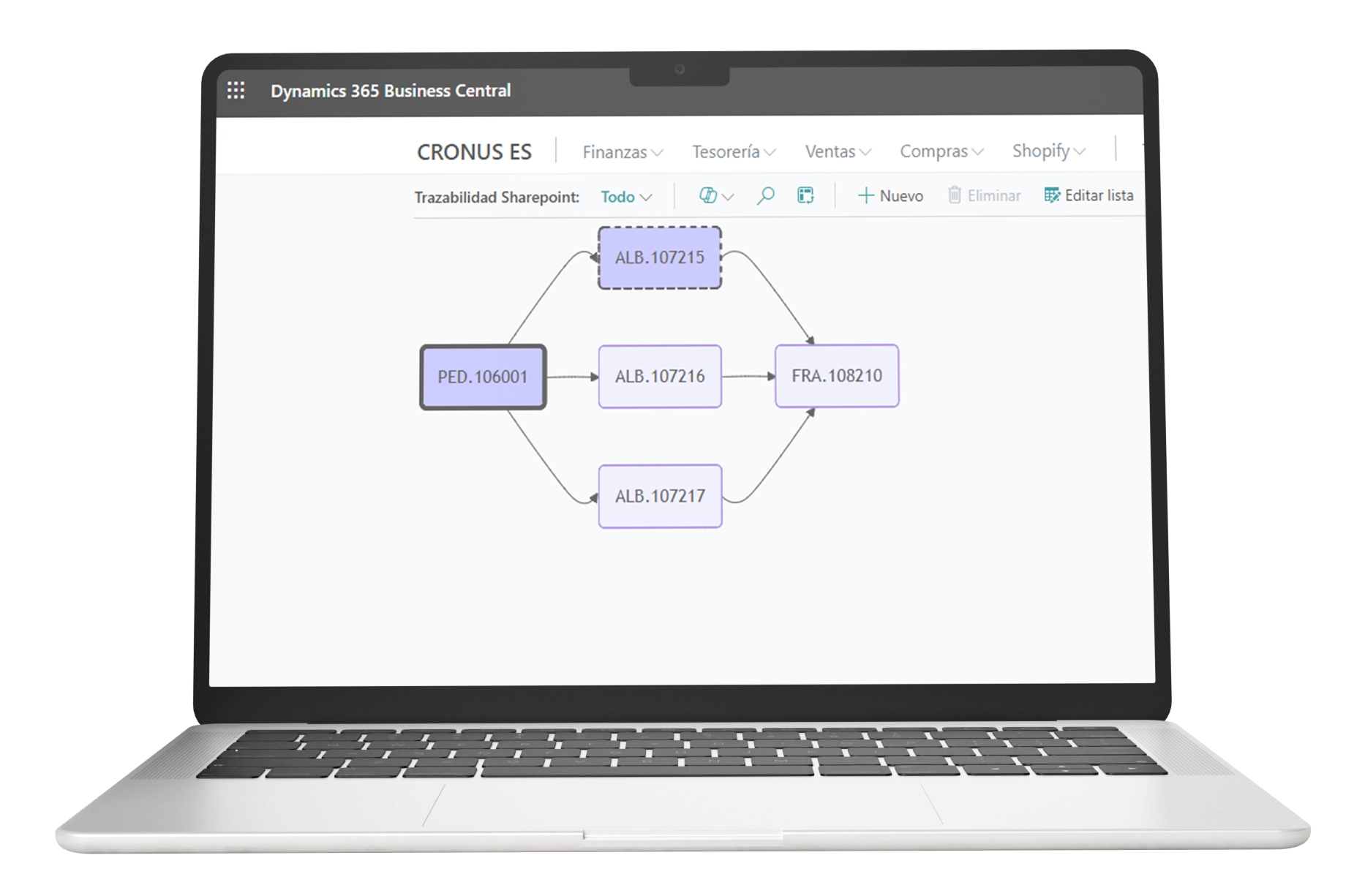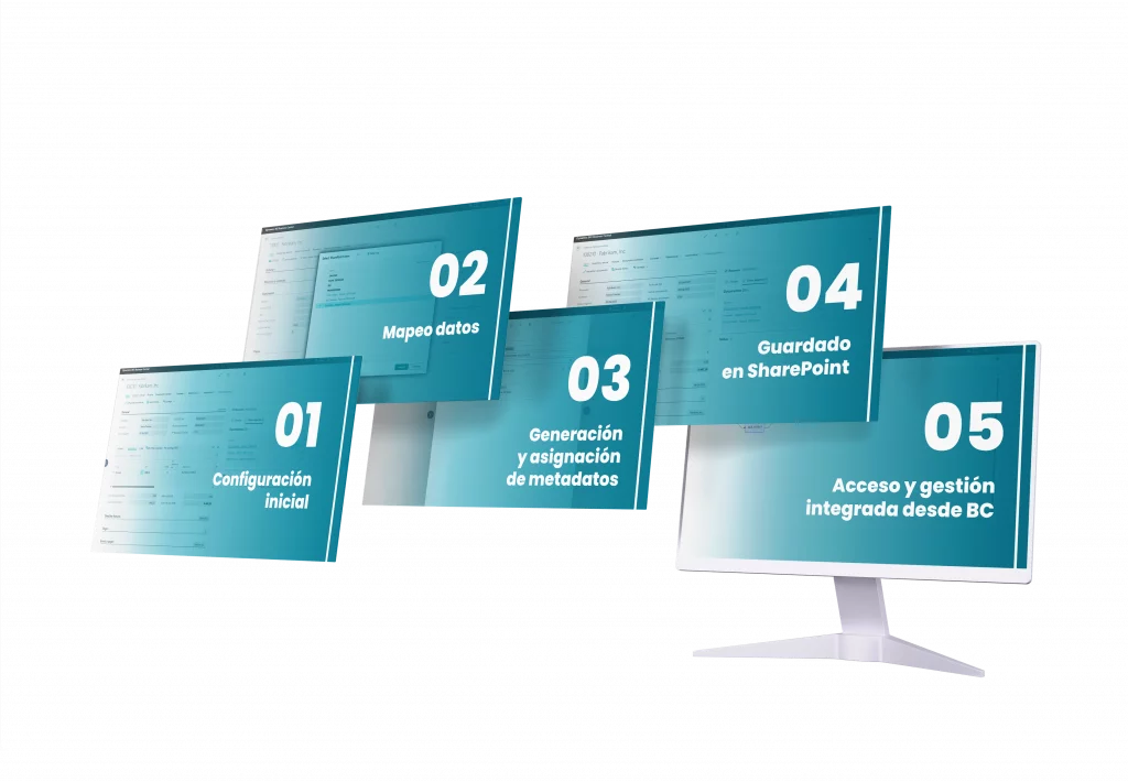 Cada vez que generes una factura, pedido o albarán en BC, el documento se guarda automáticamente en SharePoint con metadatos para búsquedas rápidas.